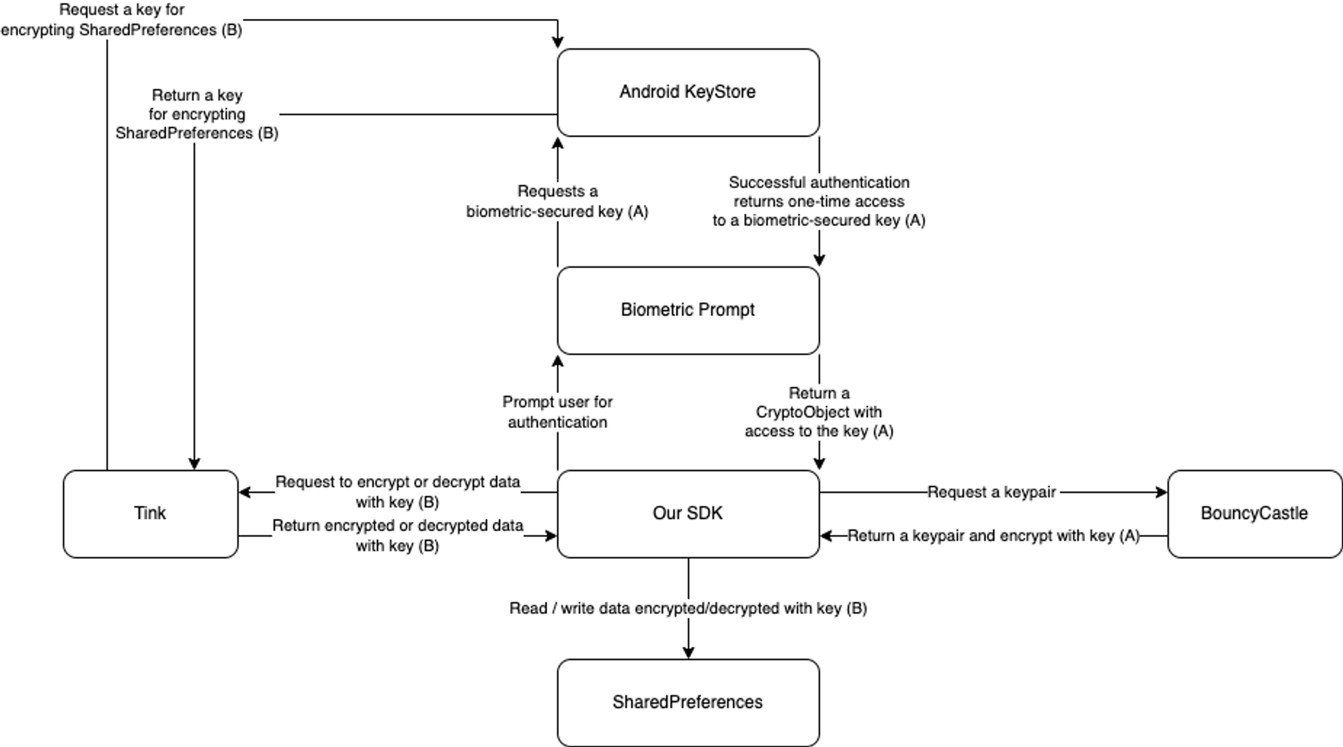 A high-level diagram of how our flow uses the Android Keystore and SharedPreferences looks something like this: