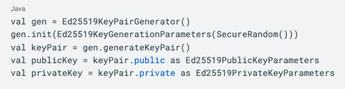 Tink, which is a Google product, is a multi-language, cross-platform cryptography solution which integrates with both on-device (Android Keystore, iOS Keychain) and online (Amazon KMS, Google Cloud KMS) keystores. From the beginning of the Stytch Android SDK, we’ve used Tink to encrypt all data in SharedPreferences using an AES-256 key saved in the Android Keystore. When it came time to implement biometrics, we initially turned to our existing Tink implementation; but while Tink theoretically supports Ed25519 keypairs, that functionality is provided within a package that is not recommended for public consumption.