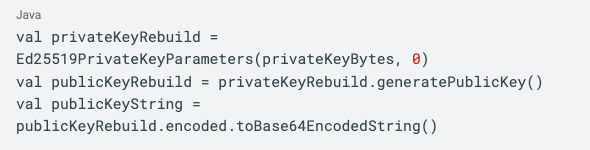 On authentication flows, we make one decryption pass to load the private key from SharedPreferences (using Tink), then decrypt it again using the biometrically-secured key from Android Keystore. Once we have the unencrypted private key byte array, we can derive the public key from it, like so: