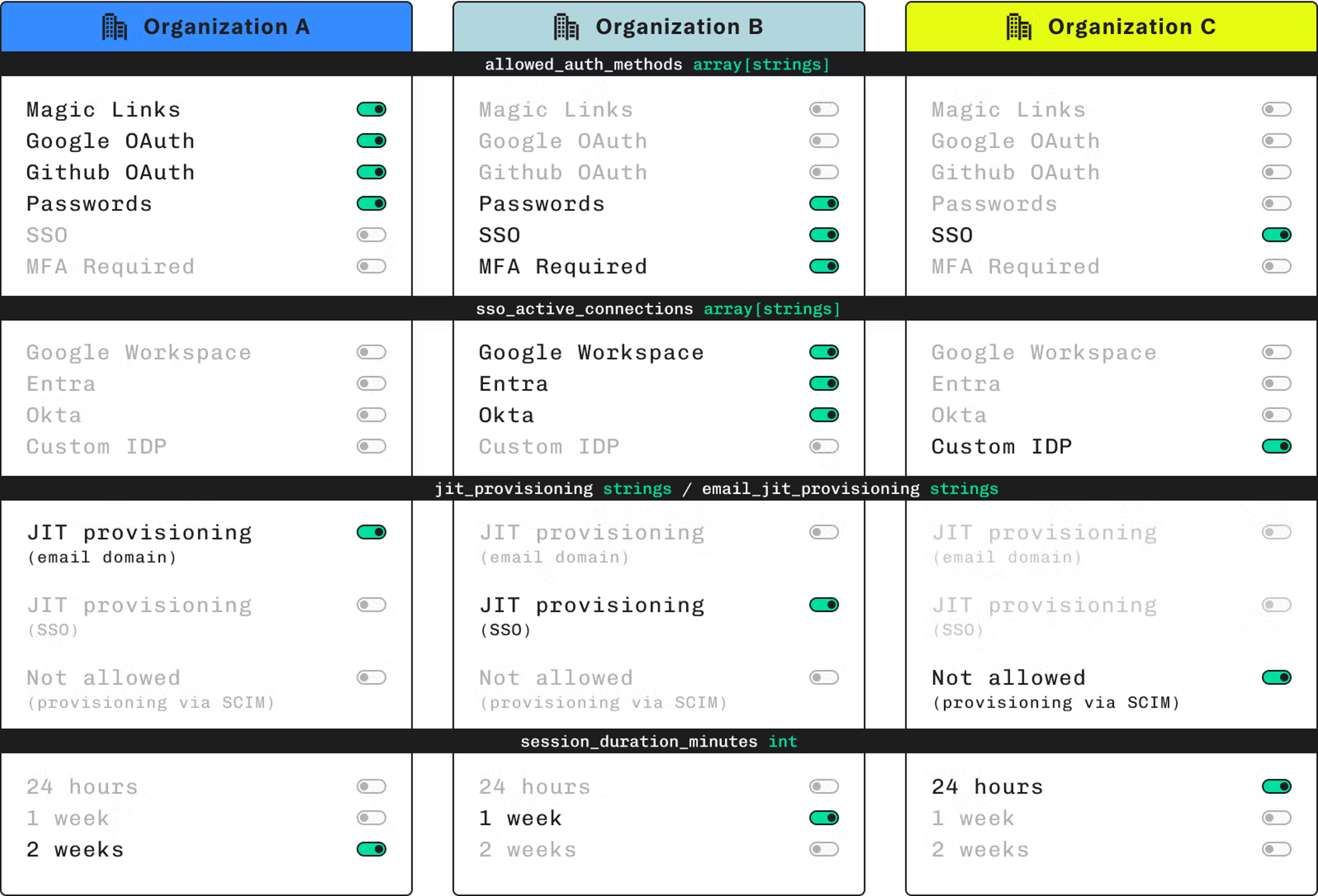 An example of how Stytch allows authentication methods to be set on a per organization basis is shown below.