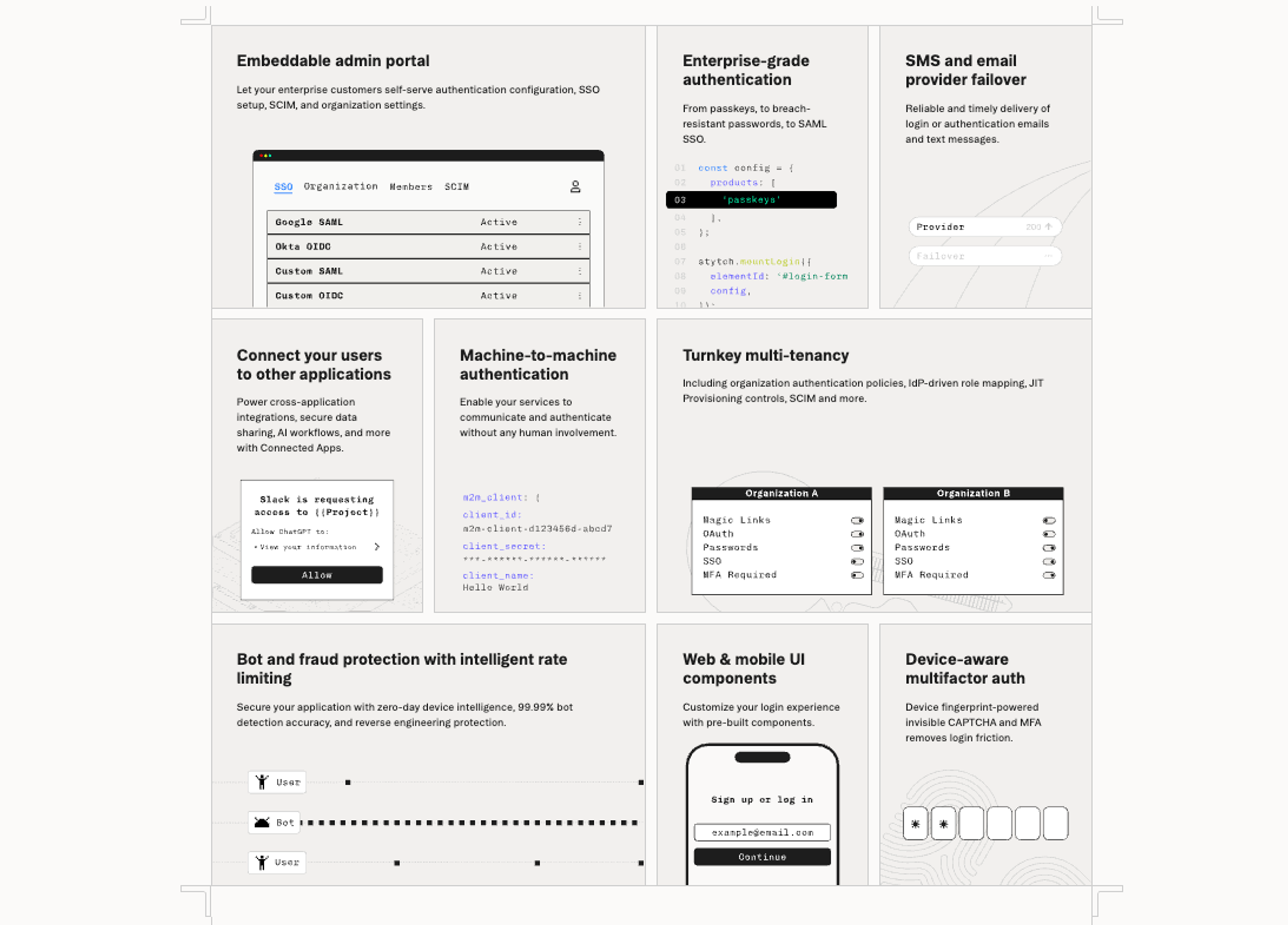 The best platforms today go beyond simple authentication methods — they need to offer multi-factor authentication as well as enterprise-ready features like Single Sign-On (SSO), System for Cross-domain Identity Management (SCIM), OAuth-based third-party app integrations and even fraud prevention technology like bot detection.