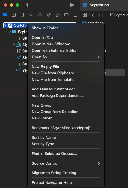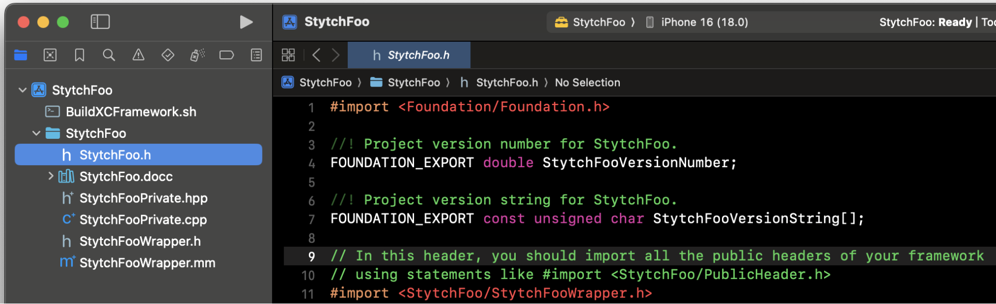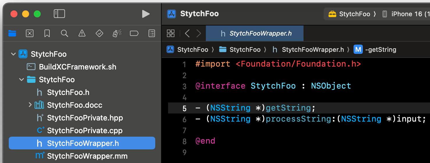 Now we can add the import statement import StytchFoo and use our StytchFoo object defined in part 1 of the tutorial in StytchFooWrapper.h and StytchFooWrapper.mm.