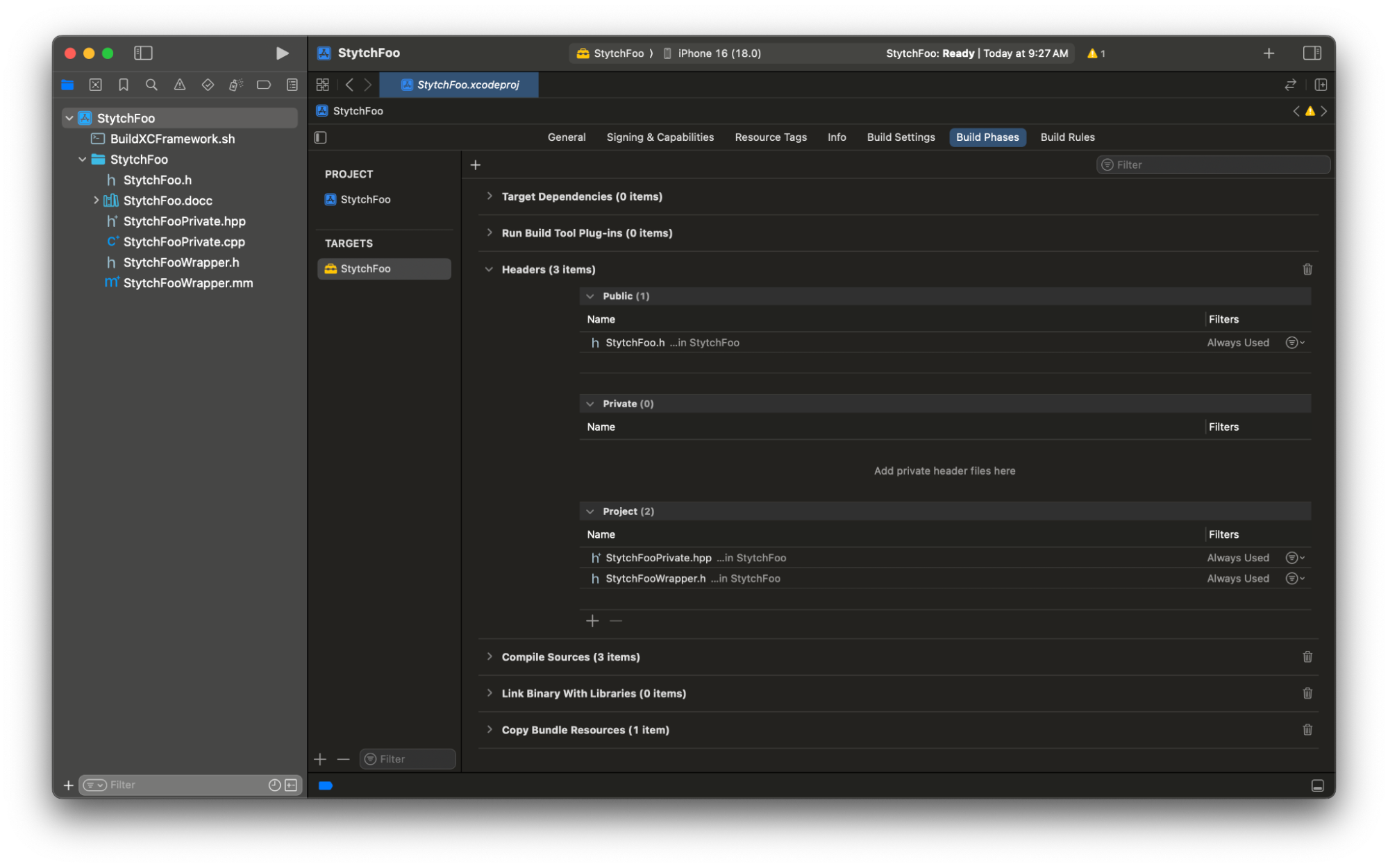 Delete the Copy Bundle Resources section by clicking the trash can icon on the right to prevent source files from being copied into the final XCFramework for distribution. Your build phases should only include the following sections.