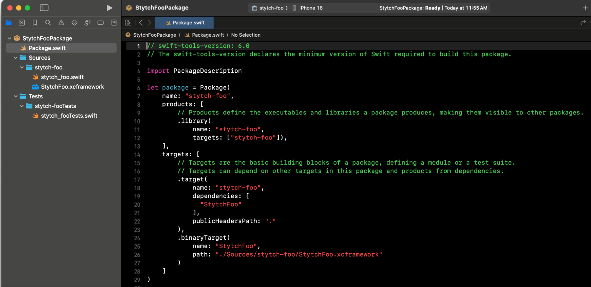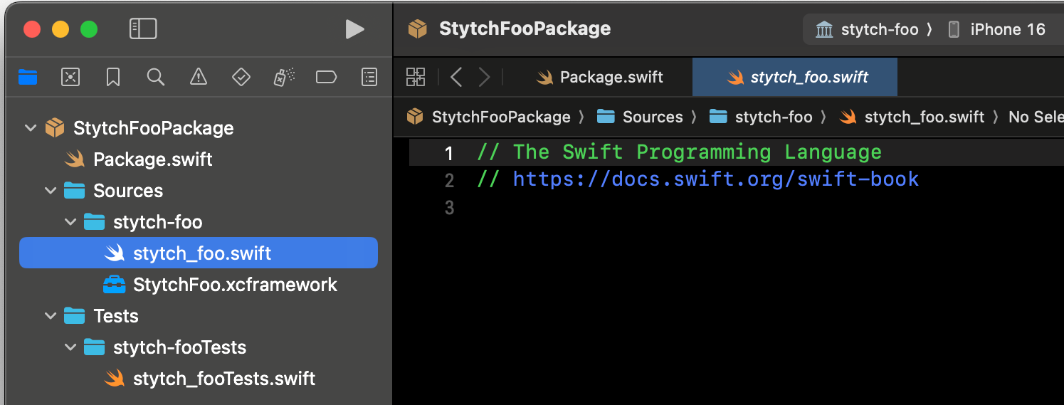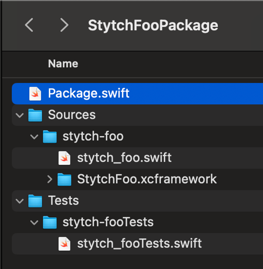 Copy your .xcframework file generated in the private repo in step 1 and copy it into the stytch-foo directory of your newly created package. It should look like this: