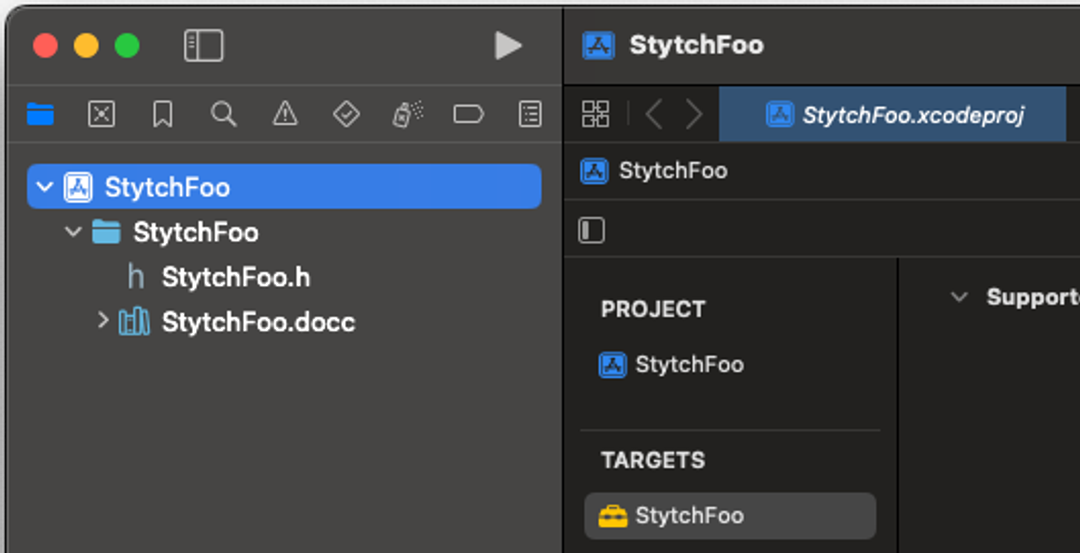 This will be the publicly visible interface to Swift, I named the files StytchFooWrapper, but named the actual Objective-C object only StytchFoo because I could not have a StytchFoo.h file as that would have collided with the public header for the framework. Therefore StytchFoo will be the name of the object we refer to in Swift code.