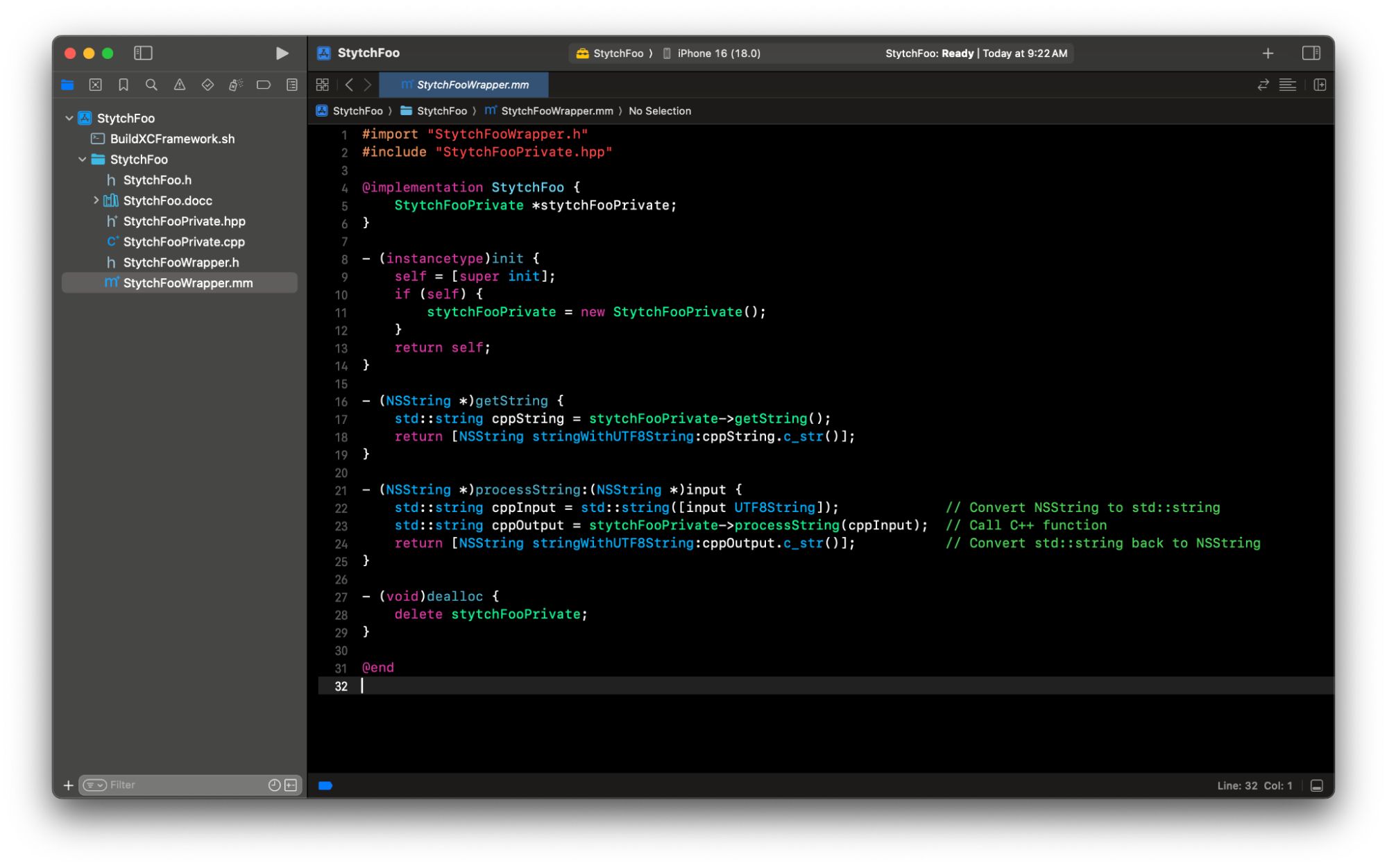 Here in the implementation file we hold a private reference to the StytchFooPrivate C++ object. A standard Objective-C file will have the extension .m but notice that the file extension for this file is .mm, which makes it a Objective-C++ file where we can write both Objective-C and C++ in one file.