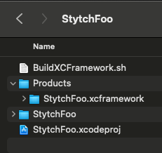 StytchFoo % ./BuildXCFramework.shAfter you run the BuildXCFramework.sh script you can check your project directory and you should see a Product directory with the built .xcframework in it. We will need to copy it into the Swift package for step 2.