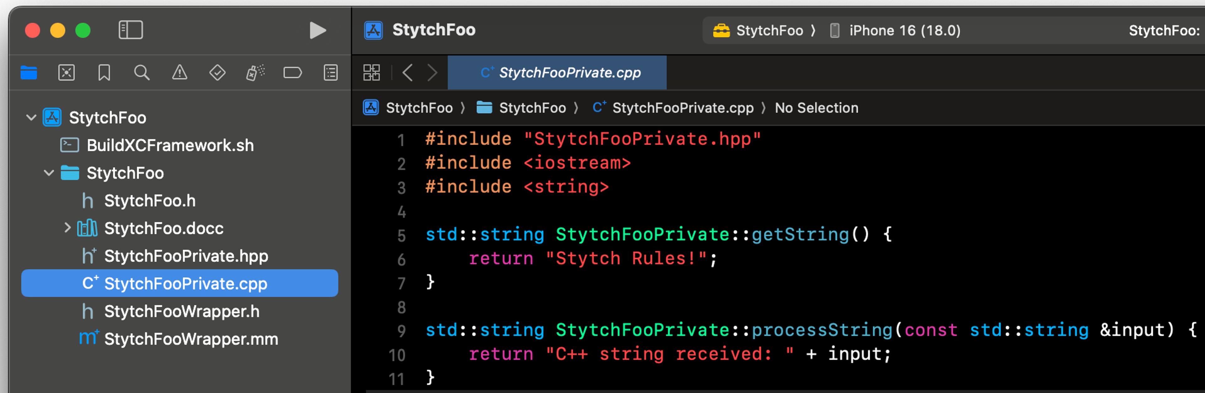 If you look in the console in the attached image you will see the log statements that match the implementation of StytchFooPrivate.cpp from step 1. Therefore this demonstrates that this Swift code is calling into C++ code.