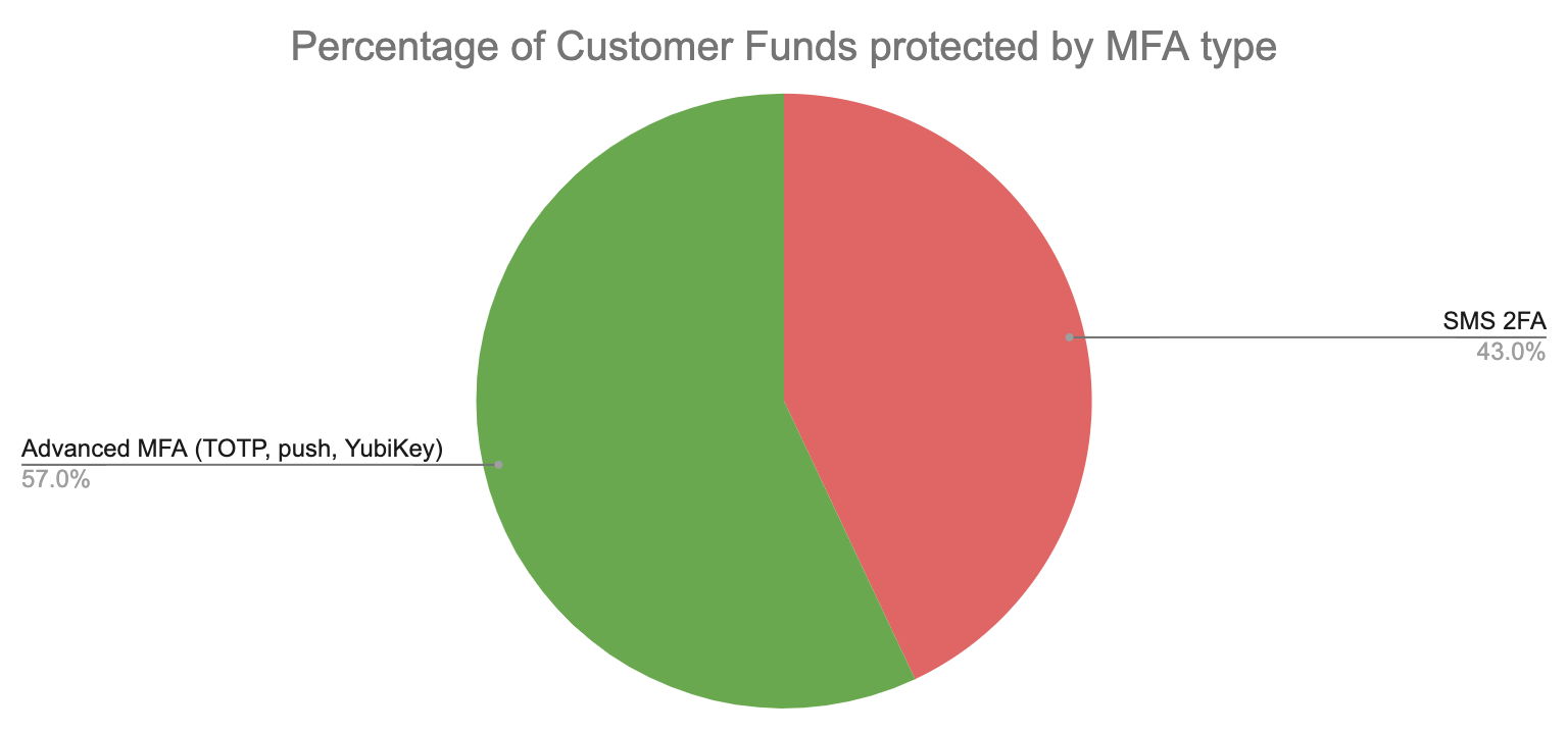 Despite most Coinbase customer funds being protected by advanced MFA, only 5% of those accounts are stolen due to the increased effort involved in attackers’ trying to break those MFA methods. Meanwhile, SMS 2FA protects only 43% of Coinbase customer funds but comprises nearly all (95%) of account takeovers.
