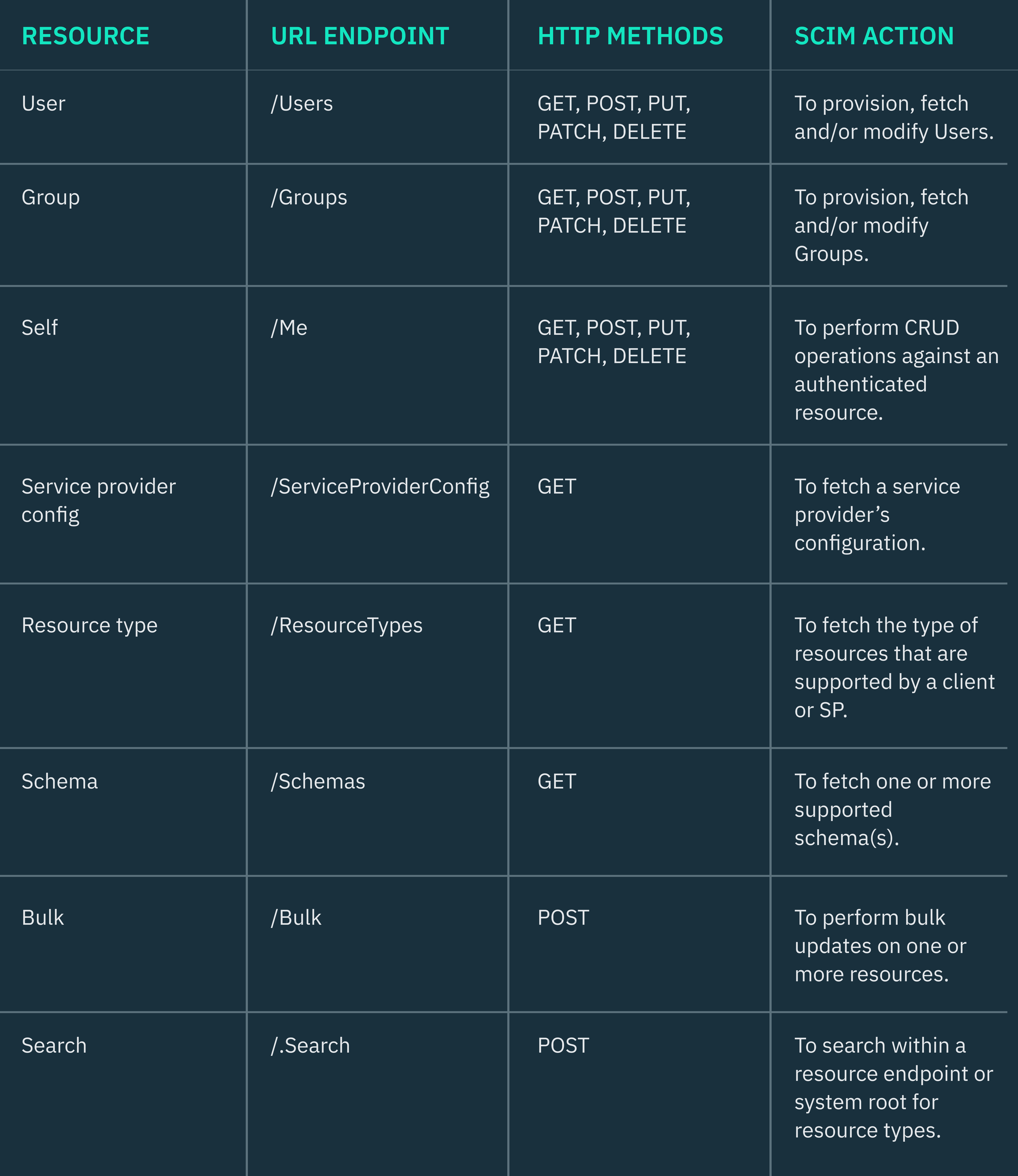 We’ve compiled a comprehensive table that outlines the RESTful endpoints defined by the SCIM protocol and the kind of HTTP operations that can be performed against them. You can find the table below.