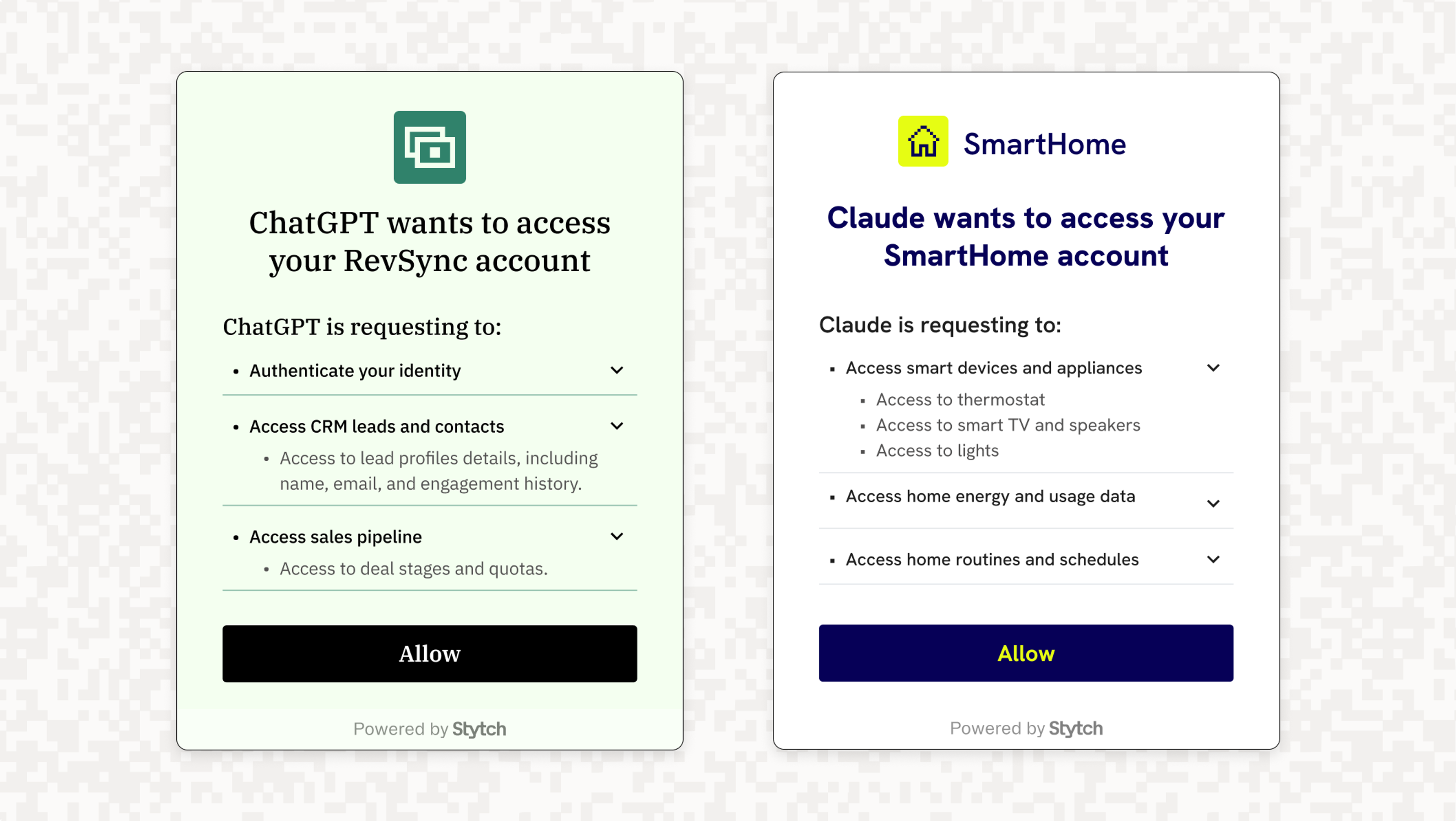 AI agents are reshaping sales, marketing, support, even everyday consumer experiences. Whether it’s an AI-powered sales agent optimizing B2B operations or a smart home AI assistant automating daily routines, Stytch provides the secure authentication and authorization layer needed to orchestrate all these operations on your platform.